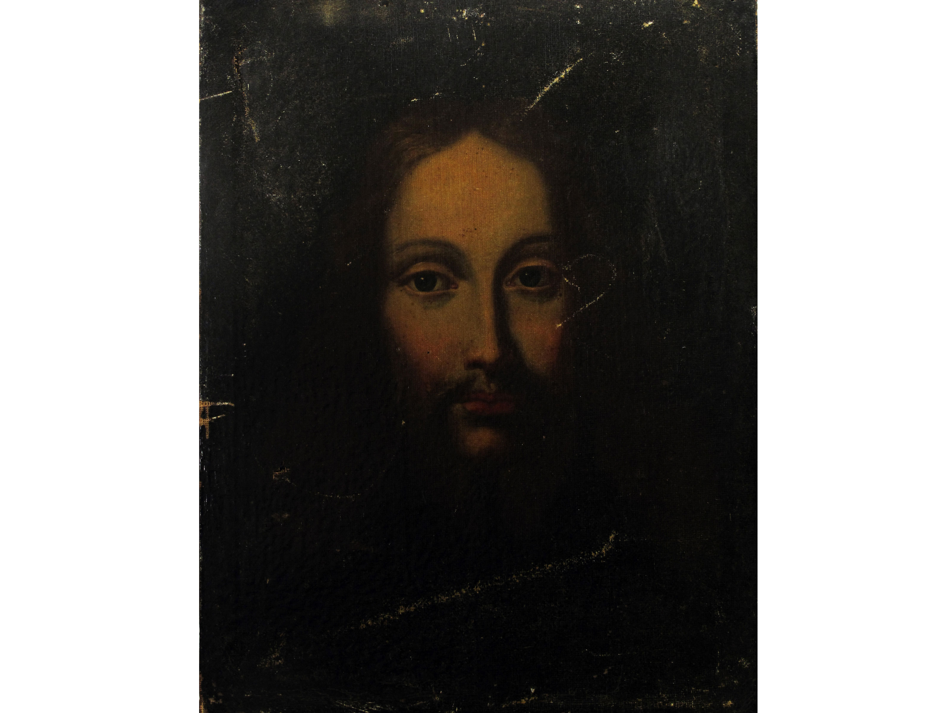 Scuola lombarda XVII secolo Volto di Cristo Olio su tela Senza cornice Prima tela, rotture Misure 44x34,5 cm