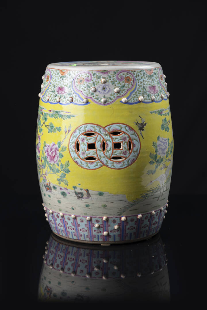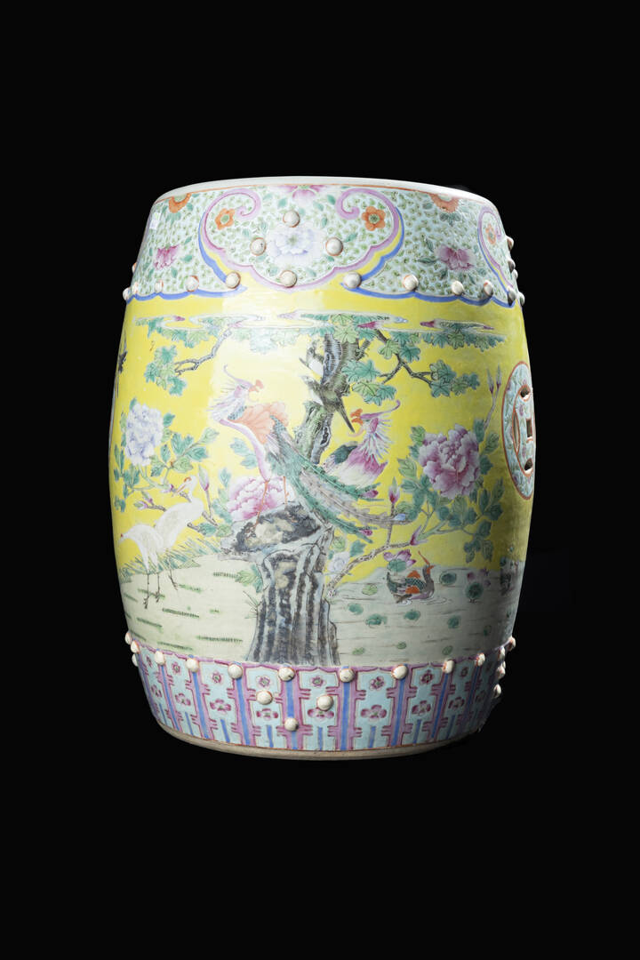 Garden seat in porcellana policroma con decoro floreale e fenici, Cina, dinastia Qing, inizi del XX secolo.