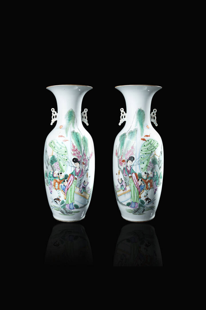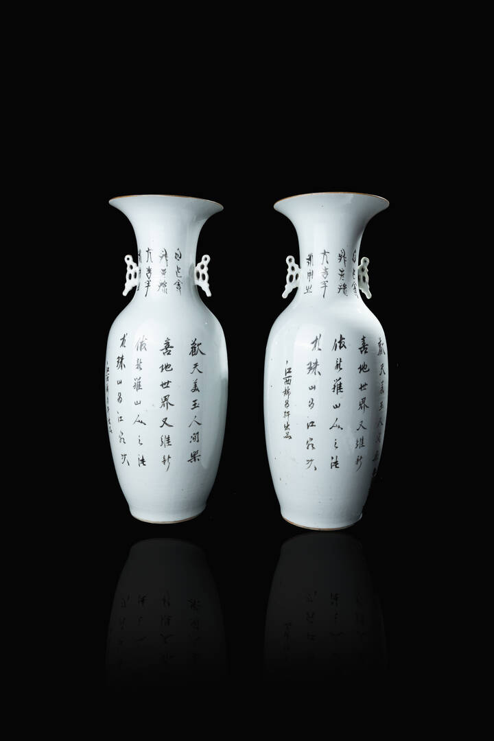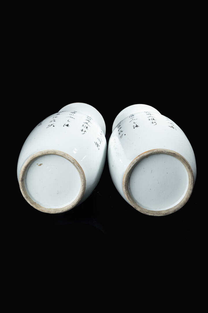 Coppia di vasi in porcellana, con raffigurazioni di scene quotidiane e scritte sul retro, Cina, dinastia Qing, XIX secolo.