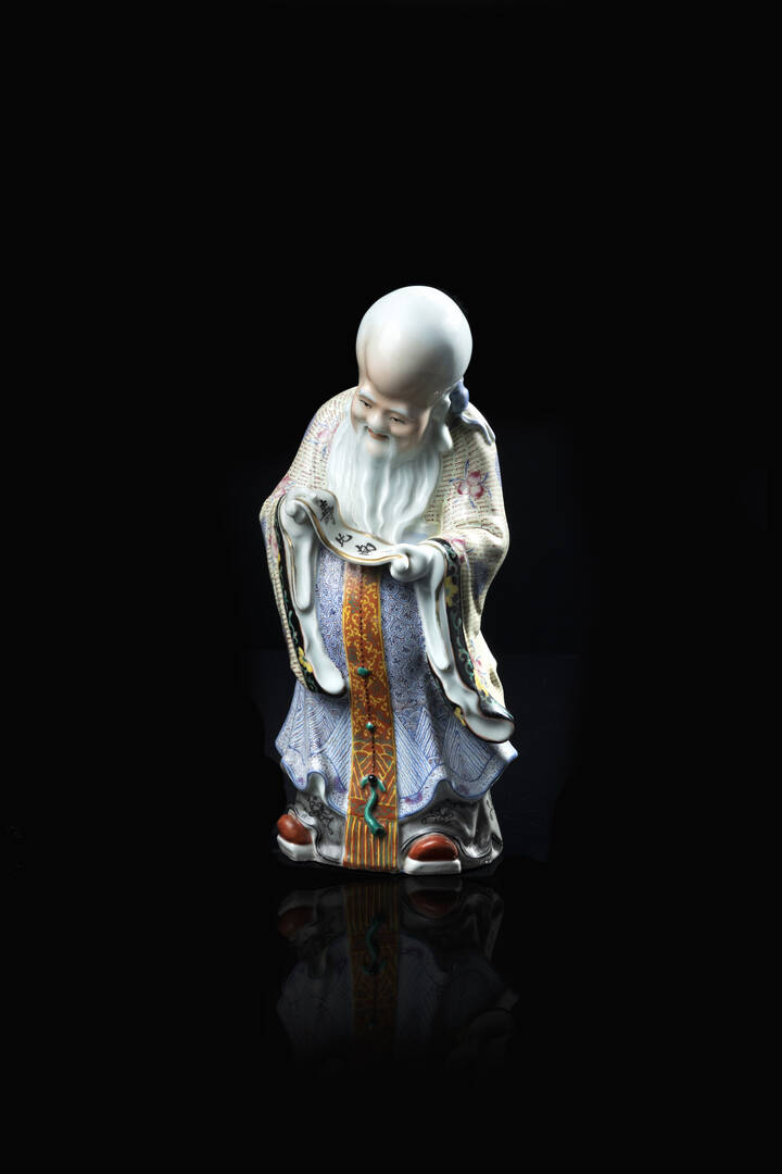 Figura in porcellana raffigurante saggio con scroll, Cina, XX secolo.