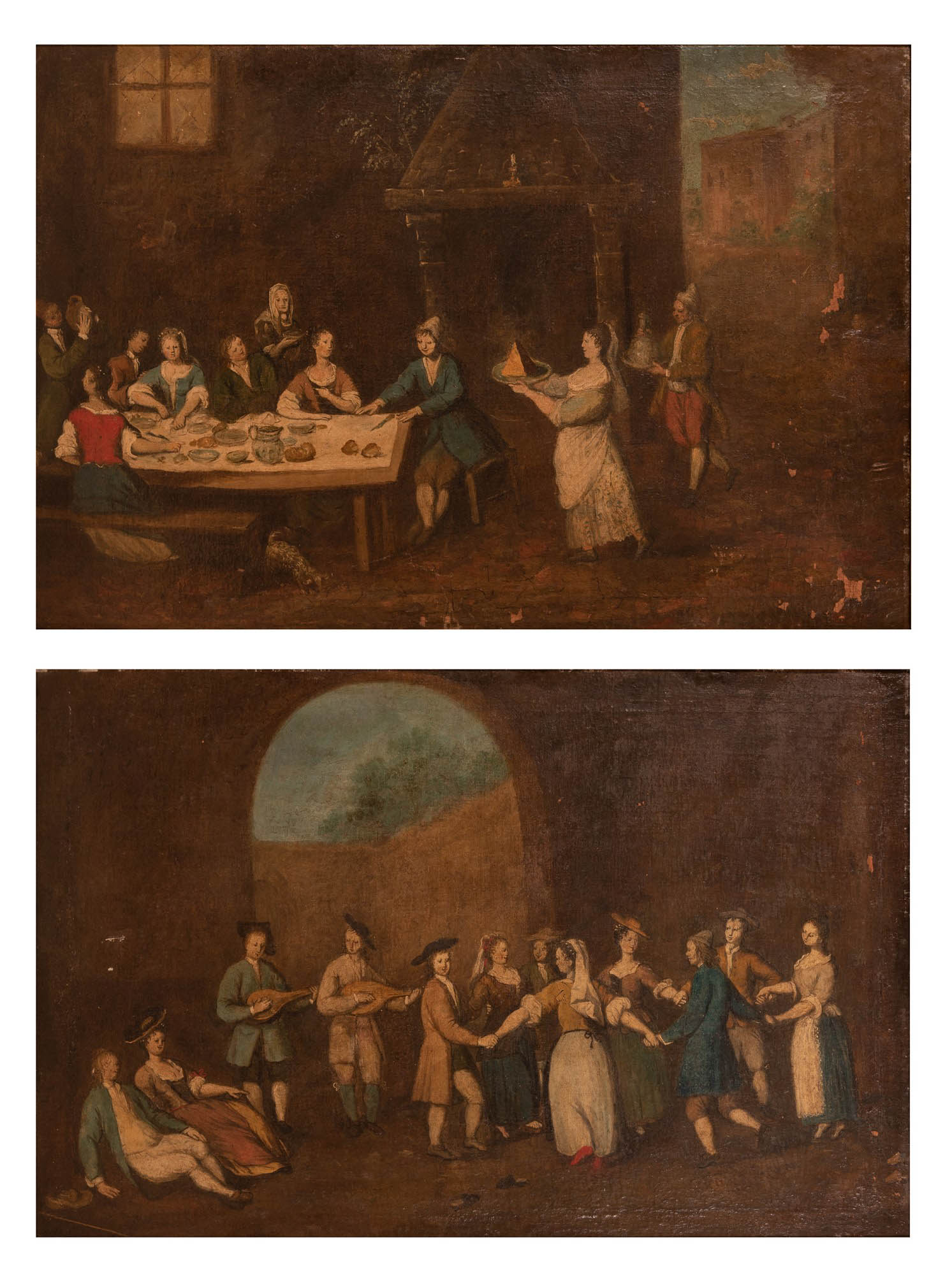 Scuola Marchigiana XVIII secolo ( - ) Coppia di dipinti raffiguranti "Scena di festa" e "Banchetto all'aperto" Olio su tela cm 62x91 e 59x89