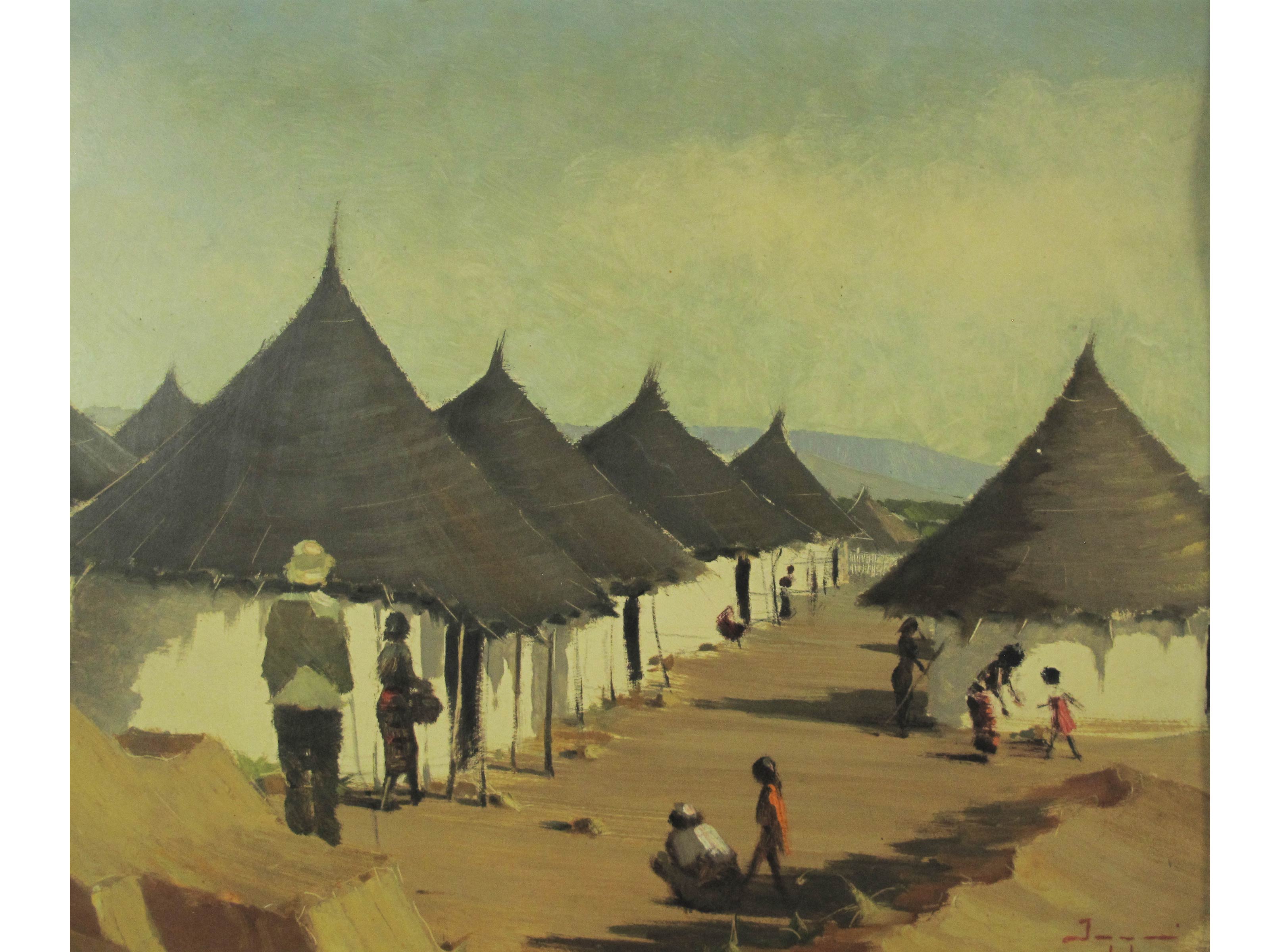 Illeggibile (XX secolo) Villaggio africano Olio su cartoncino Firmato Misure 50x60 cm