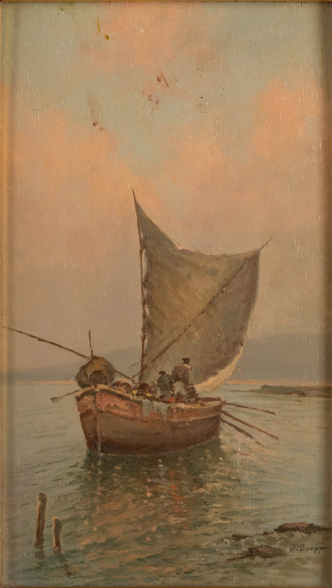 Scoppa, Radames (Napoli, 1877 - Napoli, 1957) Barca con pescatore Olio su tavola cm 27x17