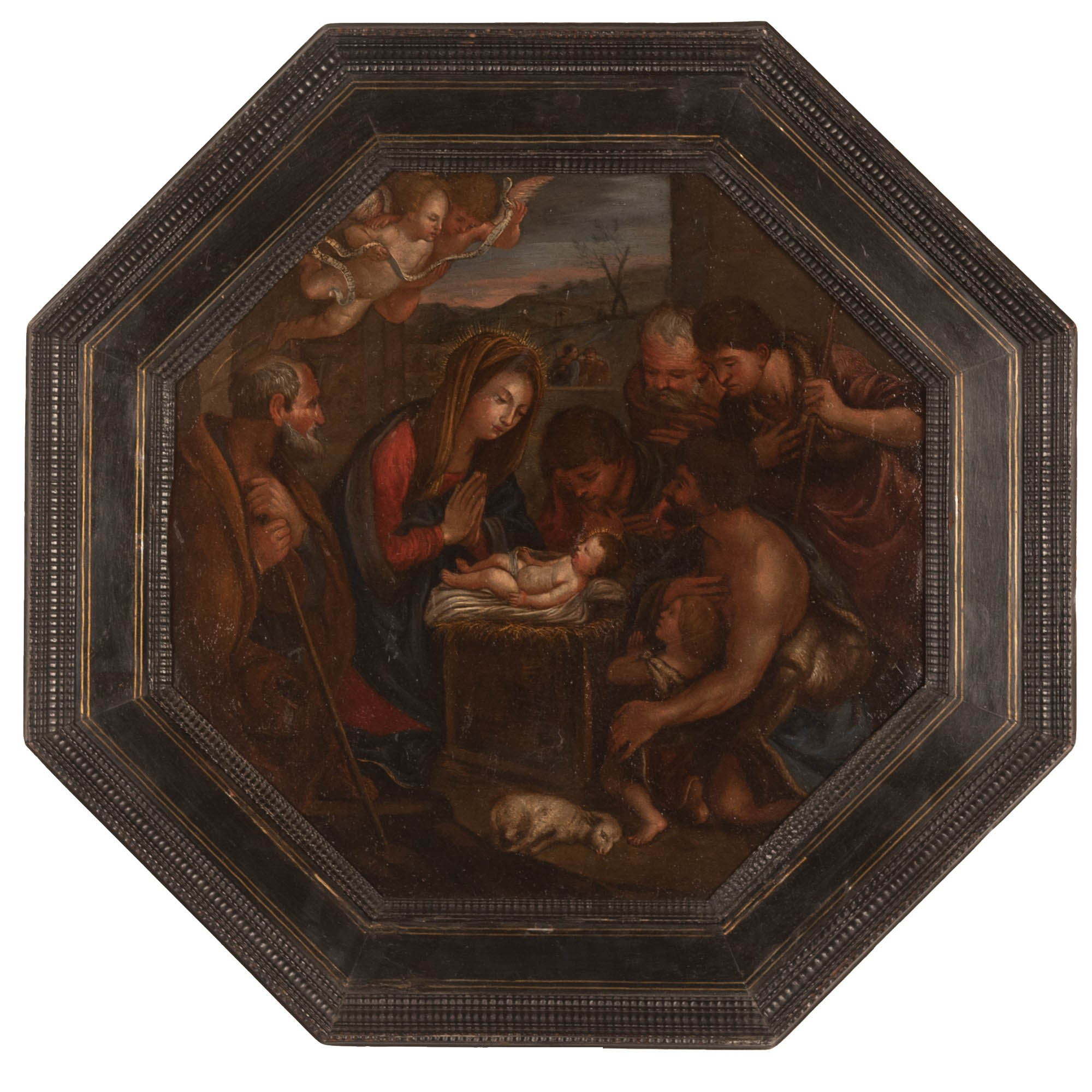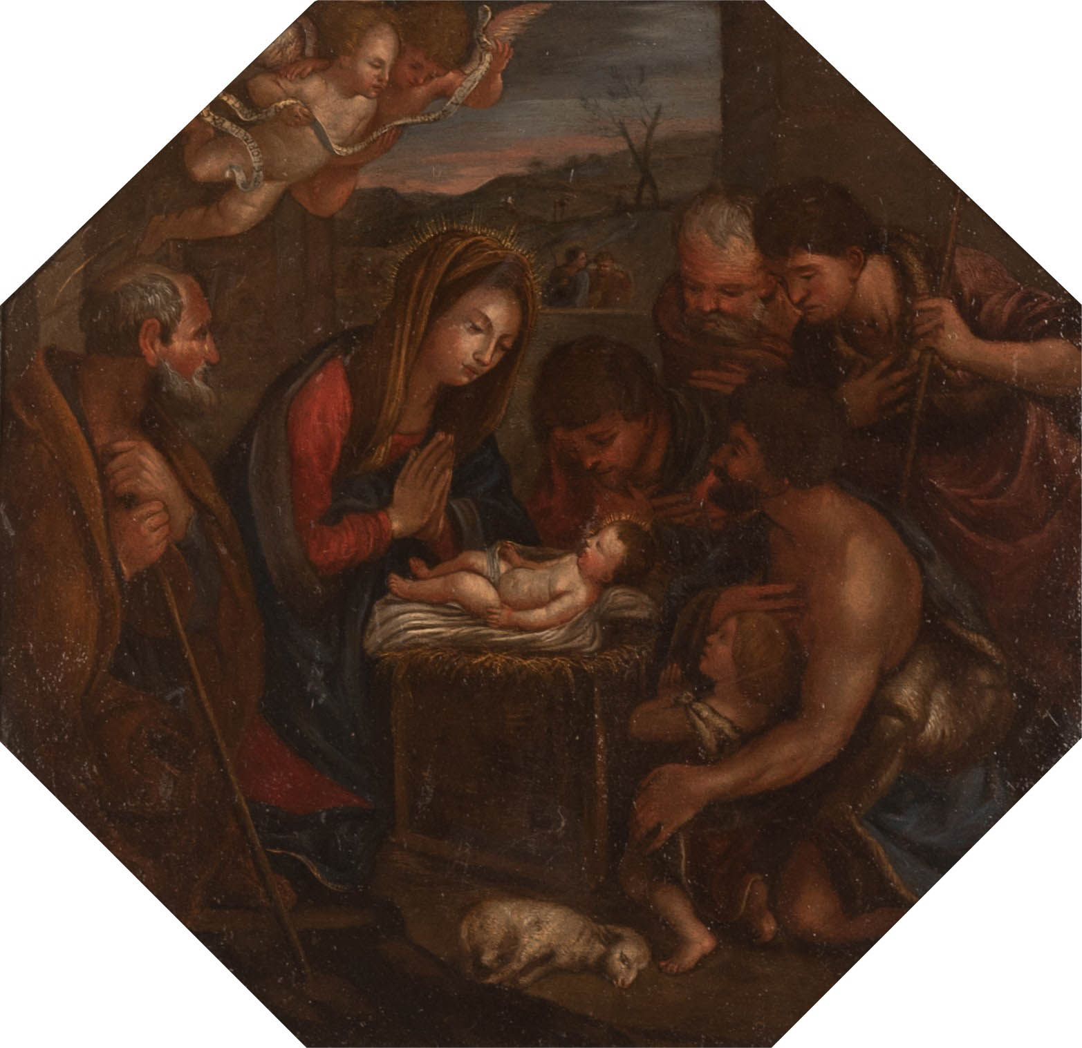 Scuola Emiliana XVII secolo ( - ) Adorazione dei pastori Olio su rame ottagonale cm 37x37