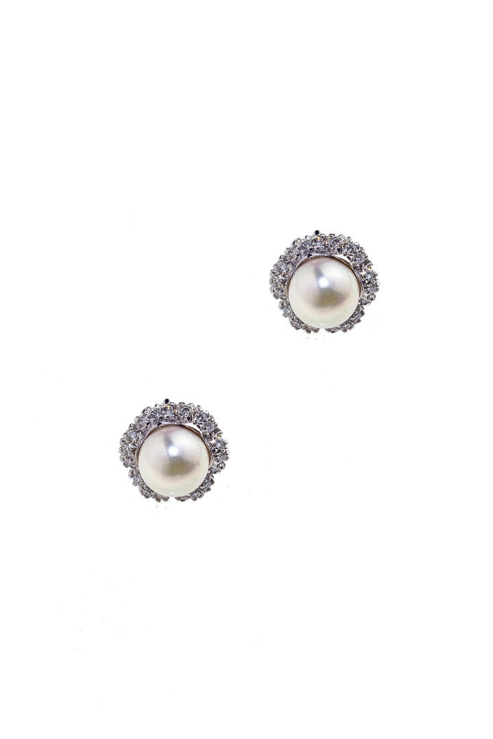 in oro bianco, a lobo, con perle giapponesi del dima di mm 8 e contorno di piccoli diamanti taglio brillante per totali ct 0,30 ca