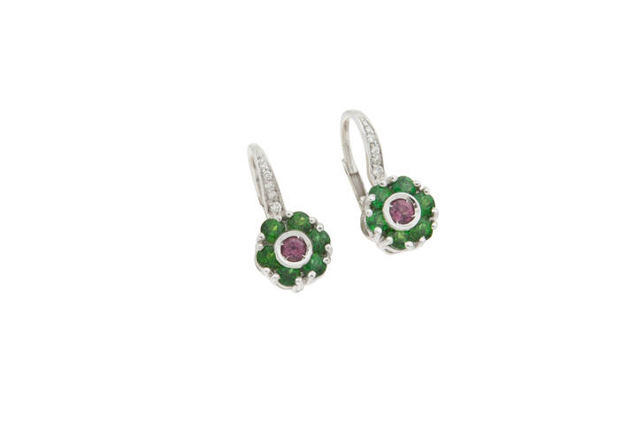 Coppia di orecchini in oro bianco, a monachella, firmati "Pasquale Bruni" con fiori in tzavoriti taglio rotondo e due tormaline rosa al centro