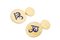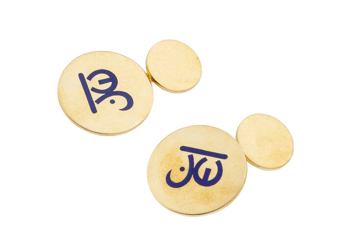 Coppia di gemelli in oro 14 Kt, firmati "Tiffany & Co", di forma rotonda con scritte in smalto blu