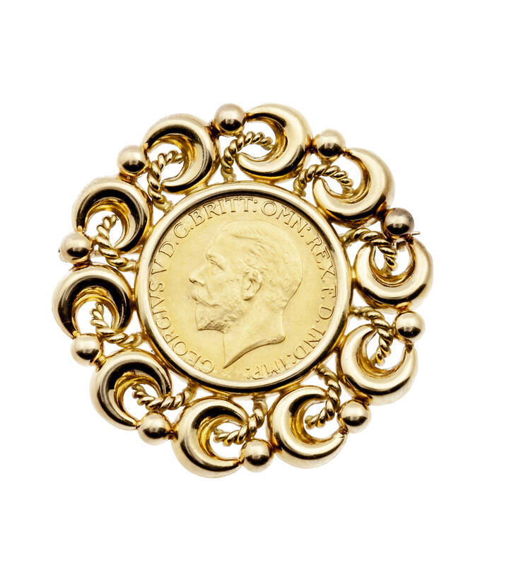 in oro giallo con al centro una Sterlina, circondata da bordo a mezzelune. Peso gr 15,8