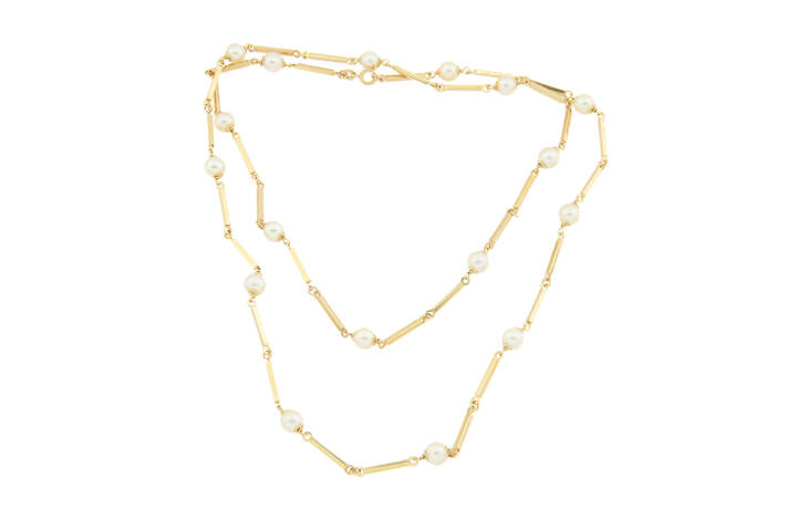 composta da segmenti rigidi in oro giallo alternati a perle giapponesi del diam di mm 6,5 ca
