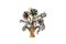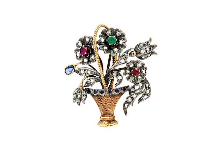 in oro a bassa caratura ed argento, a forma di vaso fiorito, XIX secolo, con fiori in rosette di diamanti per totali ct 0,60 ca e; zaffiro taglio a goccia, smeraldo e rubini taglio rotondo