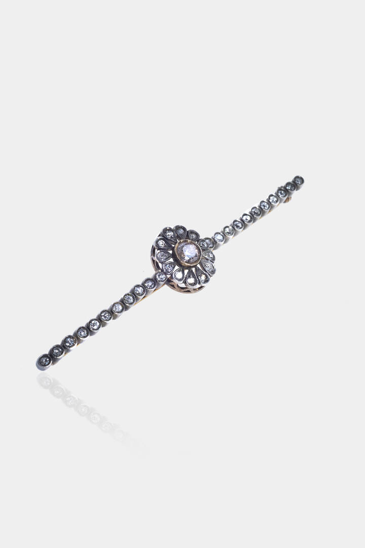 in oro a bassa caratura ed argento, inizi XX secolo a forma di barretta con diamante centrale di taglio brillante di ct 0,55 ca (fratture) e diamanti taglio brillante di vecchio taglio a decoro per totali ct 1,60 ca