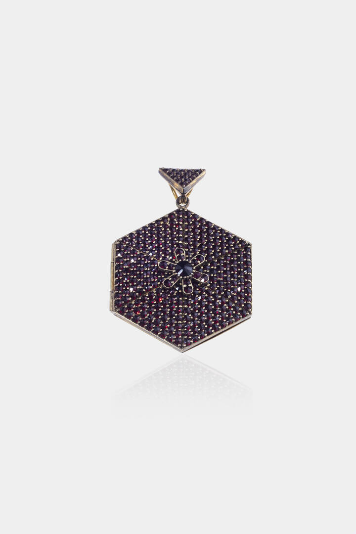 portafoto o capelli, in oro 9 Kt, di forma esagonale con pavé di granati