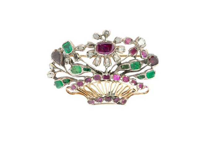 in oro a bassa caratura ed argento, XIX secolo, a forma di vaso fiorito con rosette di diamanti, smeraldi e rubini