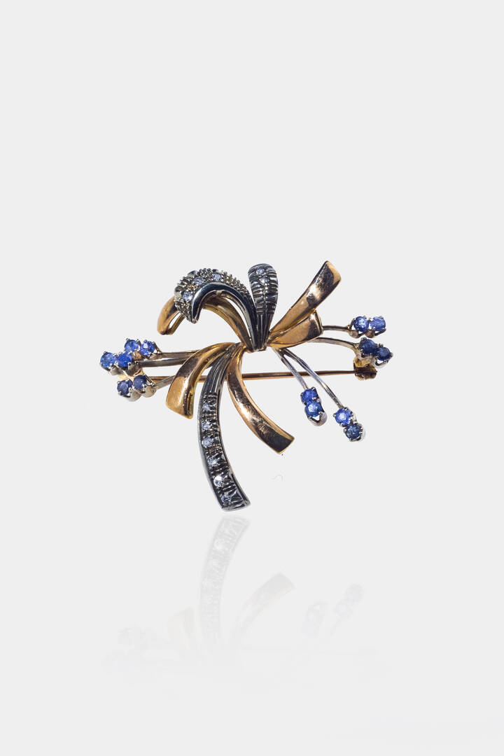 in oro bianco e giallo, anni '50, a forma di voluta intrecciata con zaffiri taglio rotondo per totali ct 0,50 ca e diamanti taglio 8/8 a decoro