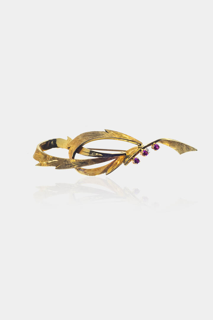in oro giallo, a forma di ramo fiorito, con tre rubini sintetici
