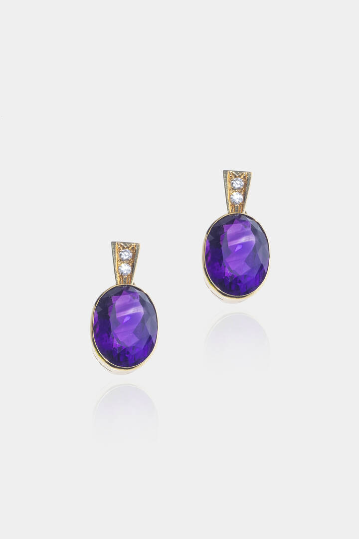 in oro giallo con al centro ametista taglio ovale, sormontata da due diamanti taglio brillante per totali ct 0,20 ca