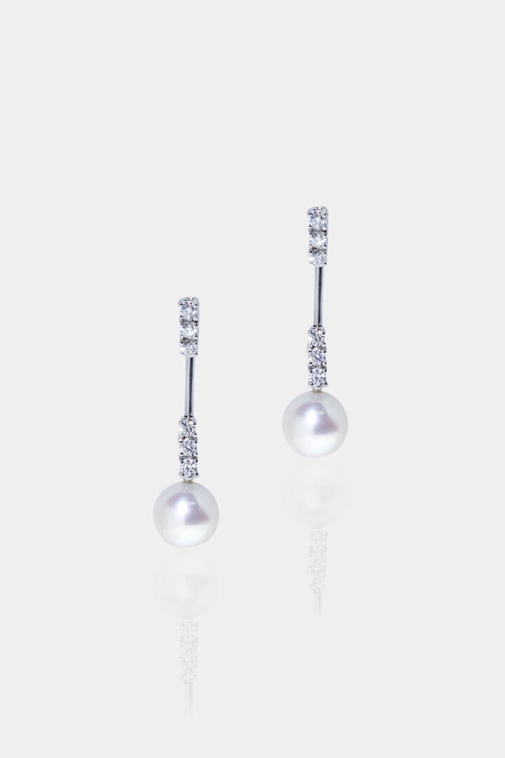 in oro bianco, corpo con segmenti rigidi terminanti con due perle giapponesi del diam di mm 8,5 e impreziositi da dodici diamanti taglio brillante per totali ct 0,50 ca