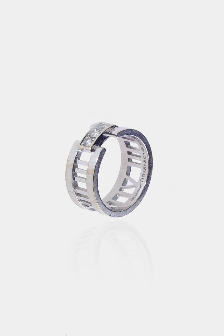 Anello in oro bianco, a fascia, firmato "Tiffany & Co", modello "Atlas", con numeri romani al centro e tre diamantini