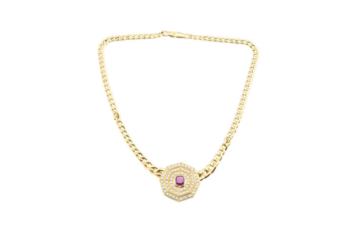 in oro giallo a maglia groumette con al centro disco ottagonale con rubino di ct 2,0 ca e diamanti taglio brillante per totali ct 2,50 ca, probabile colore F-G, purezza IF-VVS