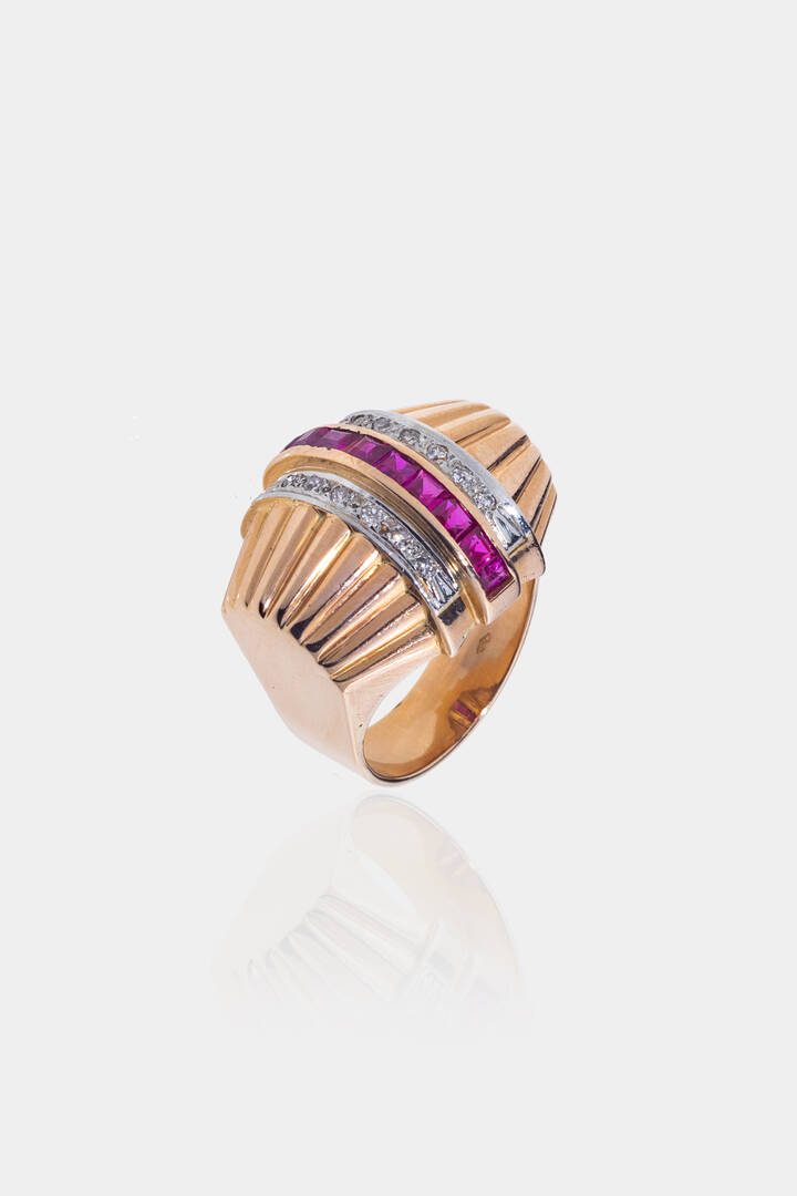 in oro rosa, sommità a mezza botte, con rubini sintetici taglio carré e diamanti taglio brillante e 8/8 per totali ct 0,12 ca