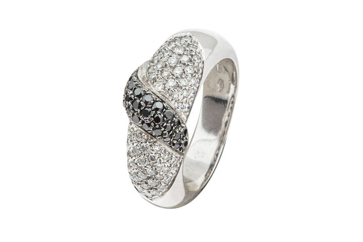 in oro bianco, a fascia, con pavé di diamanti taglio brillante di colore bianco e di colore nero per totali ct 1,0 ca