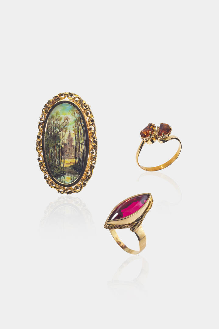 - spilla di forma ovale in oro a bassa caratura con paesaggio dipinto. Peso gr 12,8