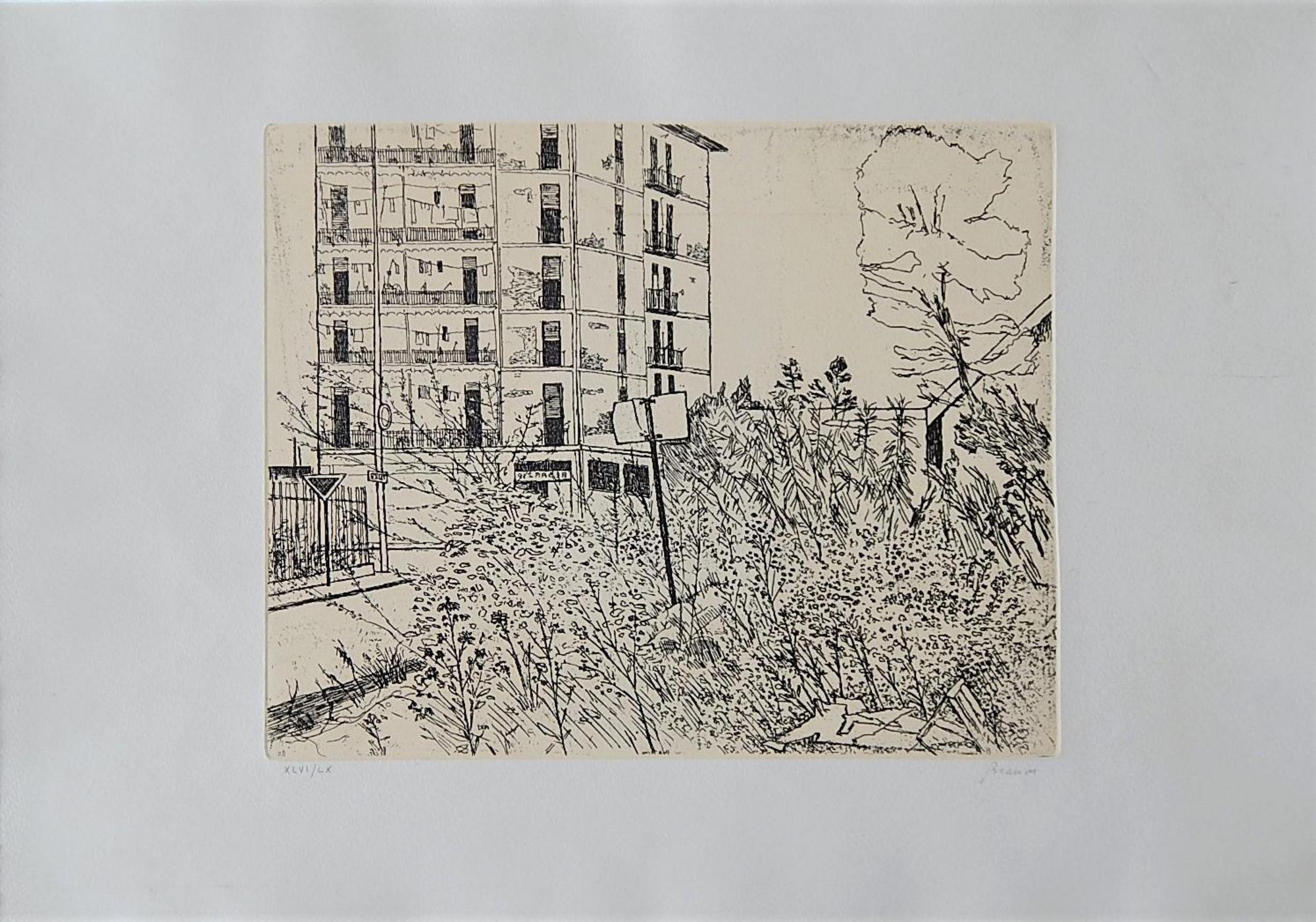 Renzo Biasion L'INCISIONE DELLA BARACCA acquaforte, cm 23,5x29,5 su foglio cm...
