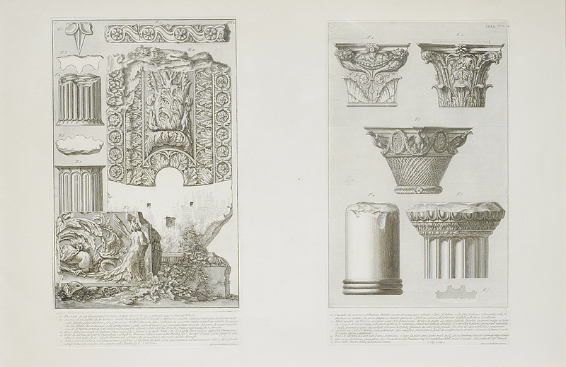 GIOVAN BATTISTA PIRANESI (1720-1778) Capitelli e cornici romane. Tavole 388 a e b Calcografia su carta 260x448 mm. (ogni lastra), 800x520 mm. (foglio) Edizione postuma. Non si rilevano marchi