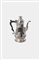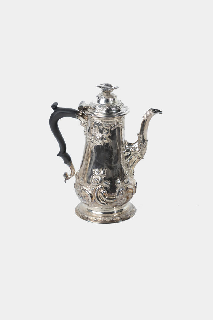 epoca Giorgio II, Londra 1755, orafo "W. Shaw e W. Preist". Corpo bombato e sbalzato con motivi floreali e vegetali; presa a forma di uccello; manico in legno ebanizzato