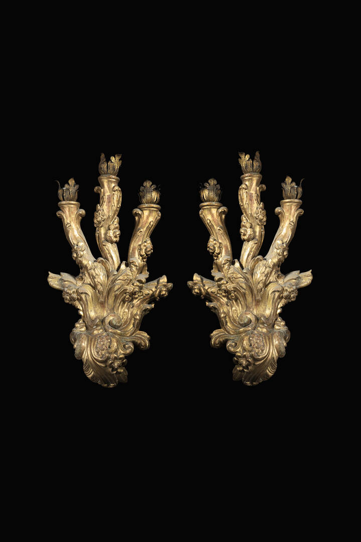 a sei luci, in legno dorato, decorati a motivi floreali e vegetali, Piemonte, XVIII secolo.