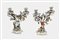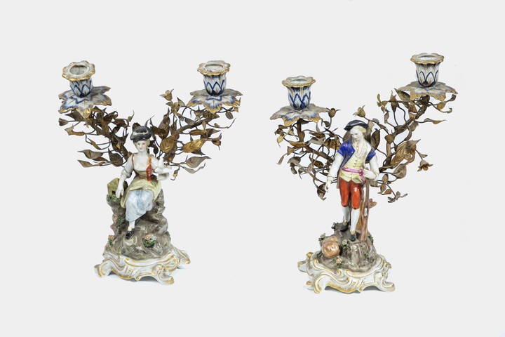 a due luci, in ottone e ceramica di Capodimonte, raffiguranti fanciulla con colomba e gentiluomo con fucile.