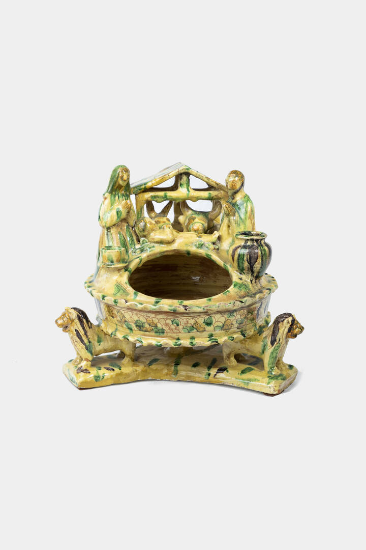 in maiolica, XX secolo, raffigurante un presepe poggiante su tre leoni.