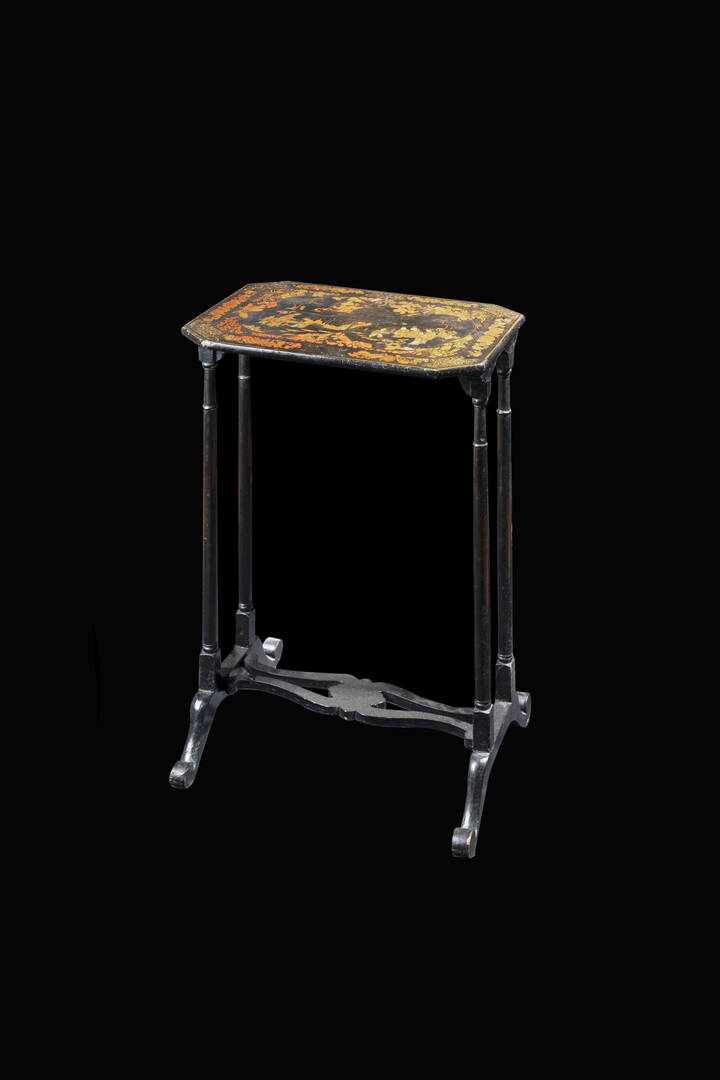 XX secolo, in legno dipinto; piano di forma rettangolare con angoli smussati decorato con motivi a chinoiserie.