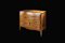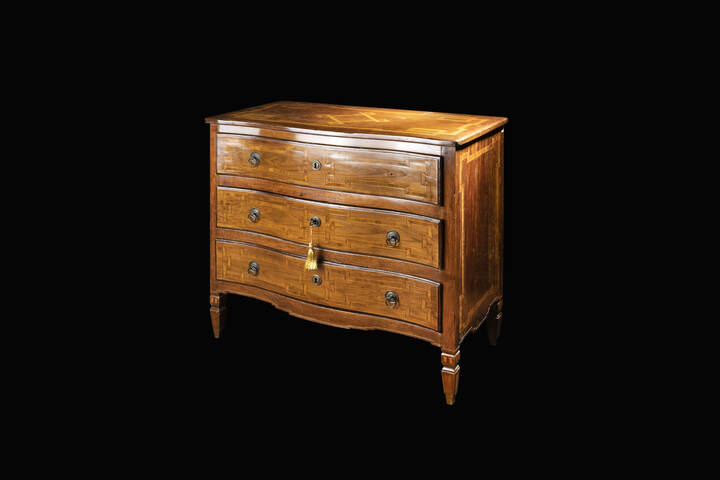 epoca Luigi XVI, in legno di noce ed intarsiata a motivi geometrici; fronte a tre cassetti