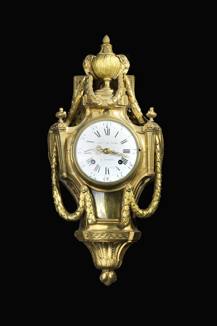 in bronzo dorato, quadrante in smalto con numeri romani e minuteria a binario periferica; firmato "To,nt Le Noir à Paris", XVII secolo