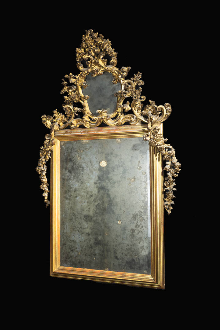 in legno dorato, fregi e cimasa decorati a motivi rocaille e ghirlande di fiori.