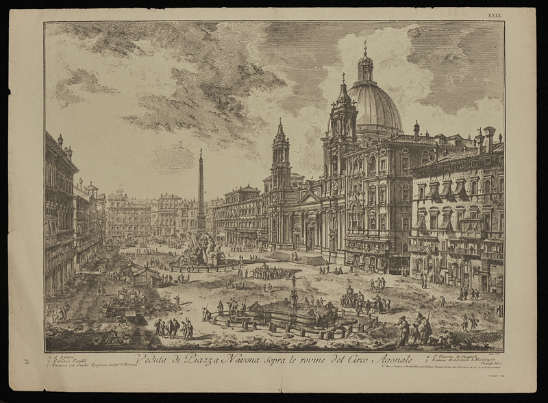 BARTOLOMEO PINELLI (1781-1835) E GIOVAN BATTISTA PIRANESI (1720–1778) Il cocomeraro vicino alla Fontana di Trevi Veduta di Piazza Navona sopra le rovine del Circo Agonale Stampa su carta 382x274 mm. Dati in lastra Le stampe sono alle due facciate di una pagina, da un volume moderno