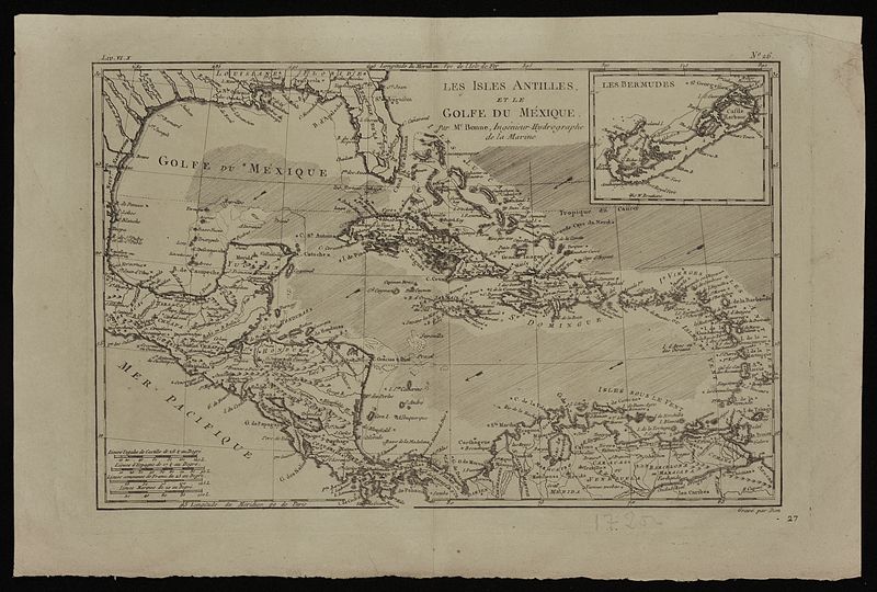 CHARLES DIEN (18091870) Les Isles Antilles el le Golfe du Méxique Calcografia su carta 341x228 mm. (lastra), 390x260 (foglio) Titolo e firma dell'incisore in lastra. Data incongrua (1725) a matita Si tratta della tavola 26 del volume IV di un'opera non bene identificata, disegnata da Charles Marie Rigobert Bonne (1727-1795) nel 1774 ca. e incisa da Charles Dien. Un altro esemplare è conservato presso il Louisiana State Museum (1997.078.037)