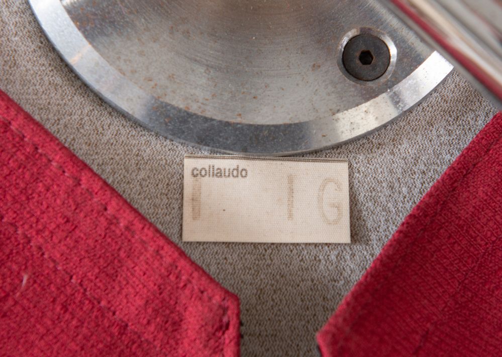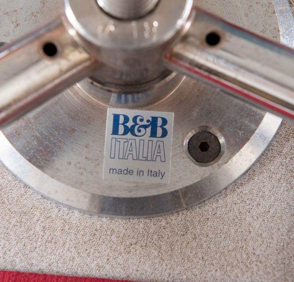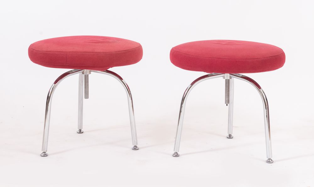 Coppia di sgabelli regolabili con struttura in metallo e rivestiti in tessuto. Marchio originale. Prod. B&B, Italia, 1980 ca. Cm 40x43x43.