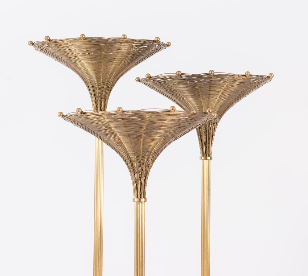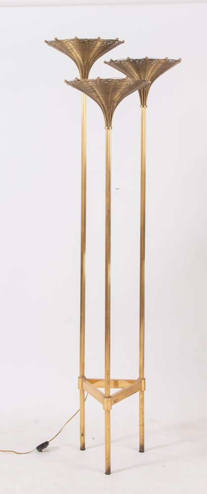Lampada in ottone con tre luci modello Papyrus. Prod. Italia, 1970 ca. Cm 190x63x63.