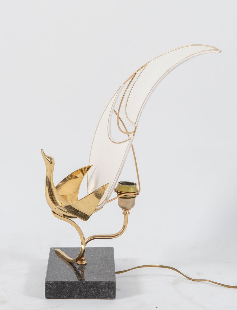 Lampada da tavolo in ottone con base in marmo e paralume in tessuto. Prod....