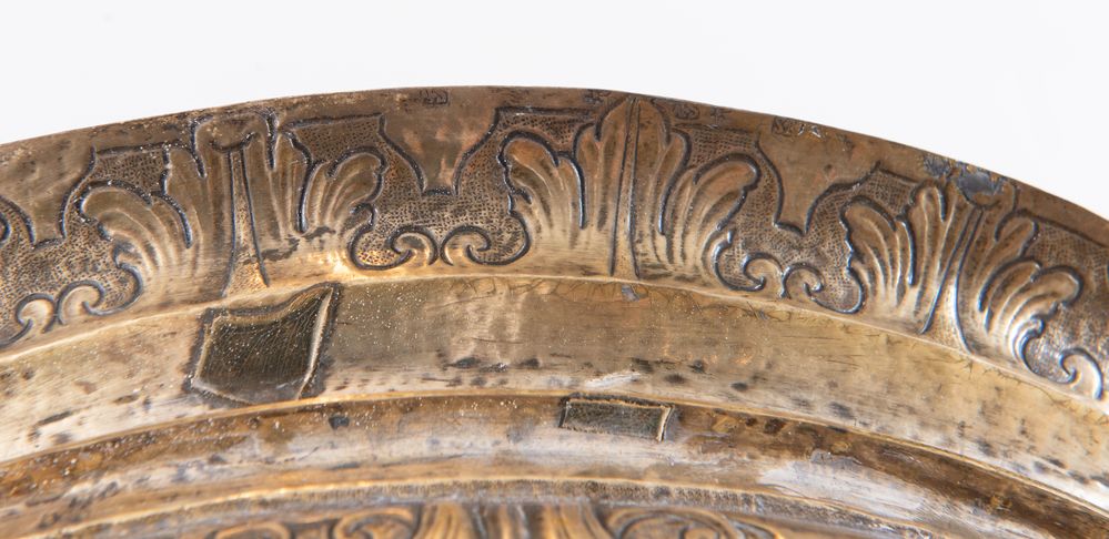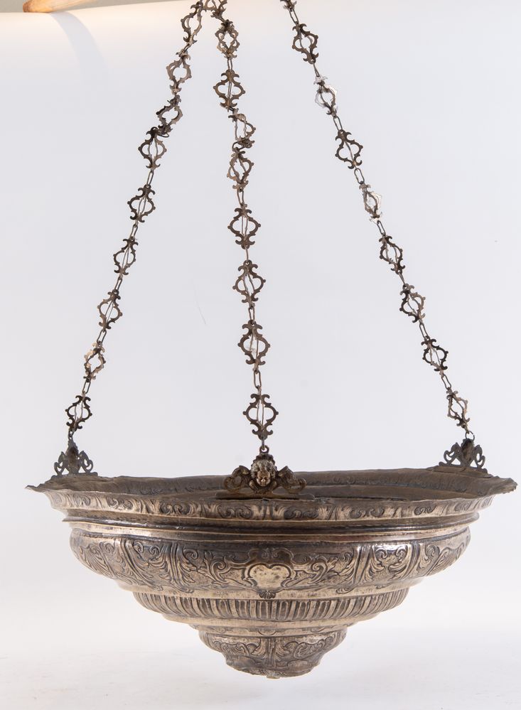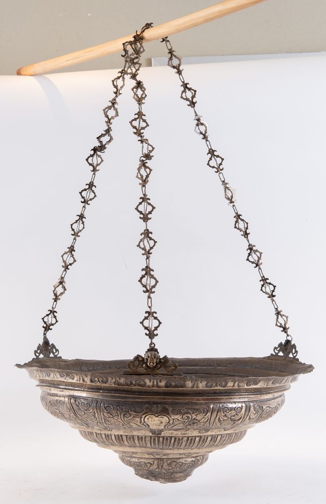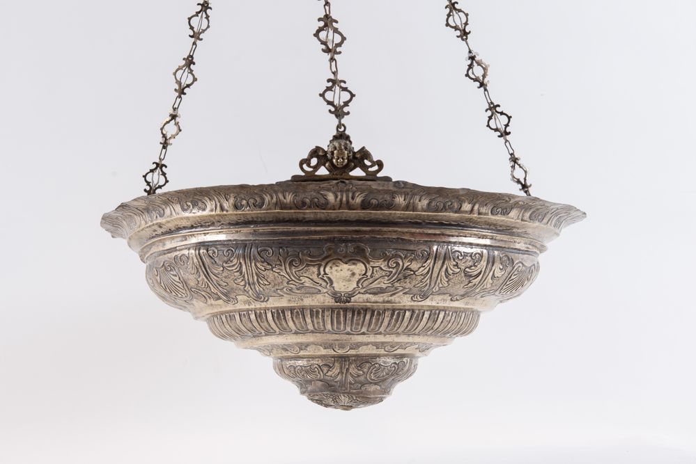 Italia, metà del XVIII secolo. Lampada votiva in argento. Reca punzoni sul bordo superiore: SM e stella. Cm 28xØ 51,5. Peso: 2931 gr. (difetti)