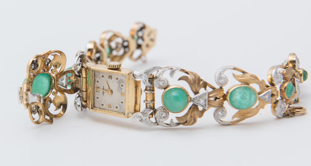 BRACCIALE-OROLOGIO CON SMERALDI E DIAMANTI en suite all'anello lotto 246. In...