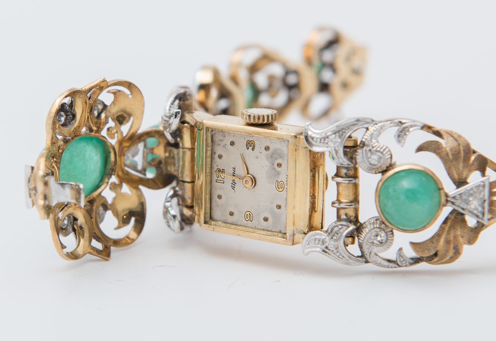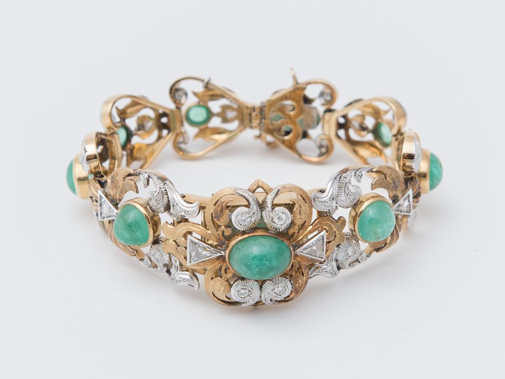 BRACCIALE-OROLOGIO CON SMERALDI E DIAMANTI en suite all'anello lotto 246. In oro giallo e bianco 18K, decorato con smeraldi cabochon e diamanti rotondi e triangolari. Orologio a scomparsa con quadrante rettangolare marcato “Alpina”. Peso complessivo: 45,71 grammi.