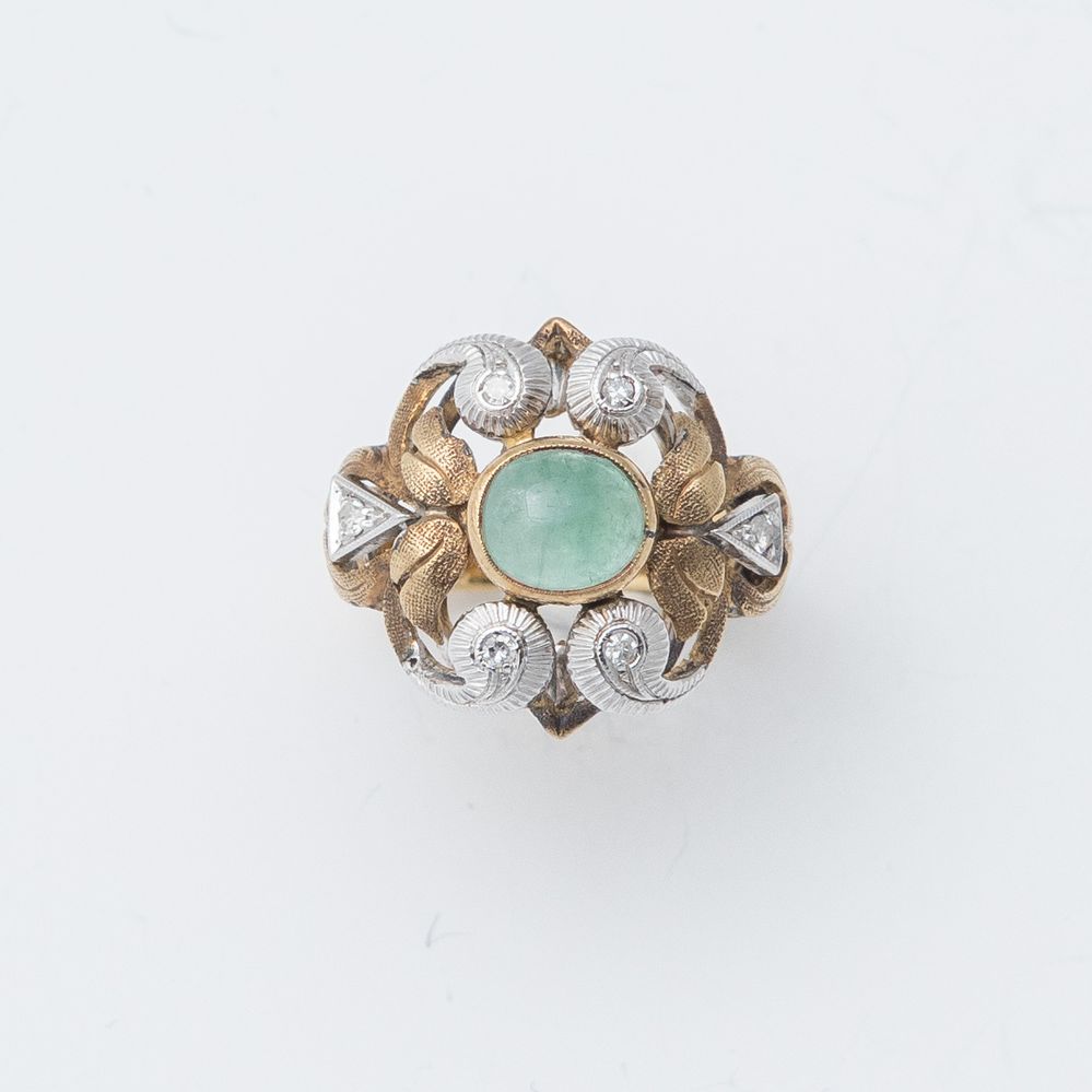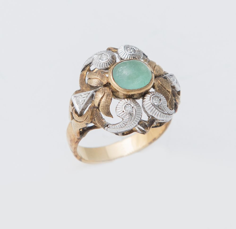 ANELLO CON SMERALDO E DIAMANTI en suite al bracciale-orologio lotto 245. Realizzato in oro giallo e bianco 18K, con smeraldo cabochon entro cornice di piccoli diamanti di taglio singolo. Peso complessivo 6,77 grammi.