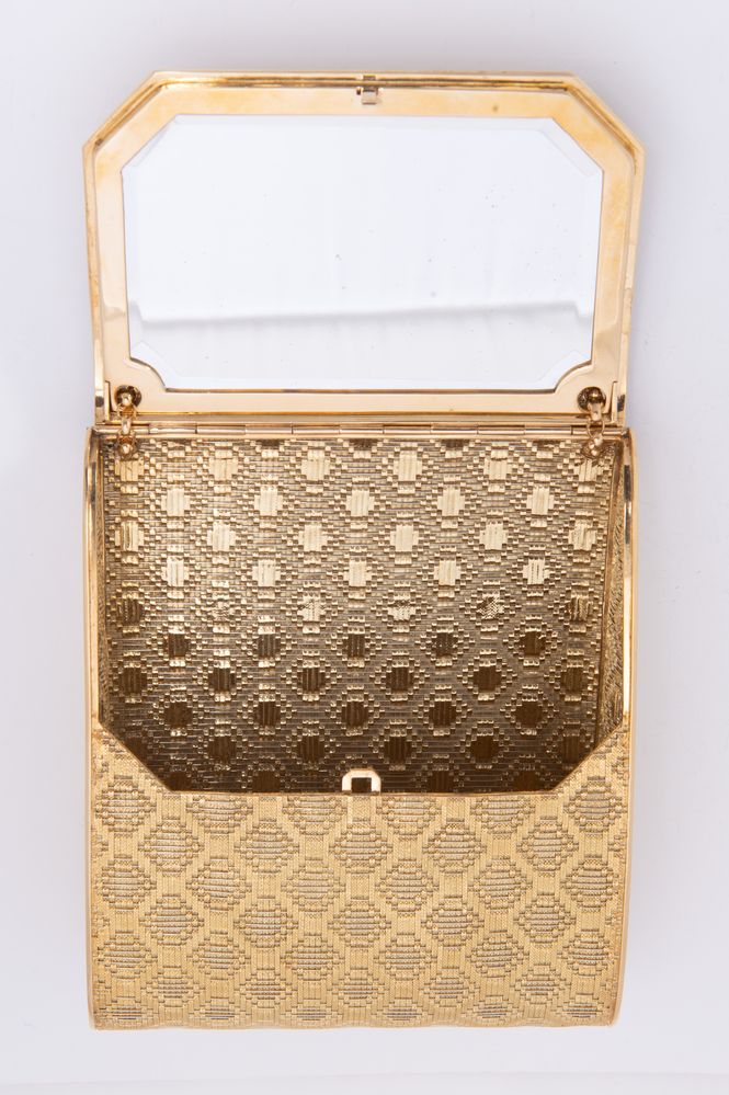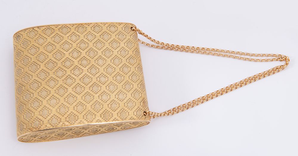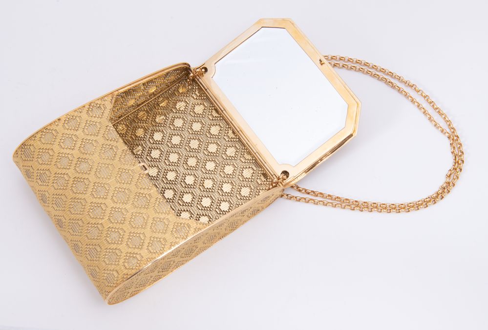 BORSA IN ORO. Borsa da sera in oro giallo e bianco 18K, di forma rettangolare bombata, realizzata in maglia d’oro intrecciata, corredata di specchio all’interno. Cm 14x12x4.5. Peso complessivo 434,22 grammi.
