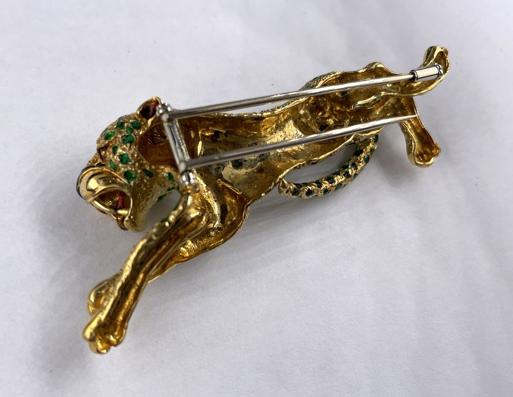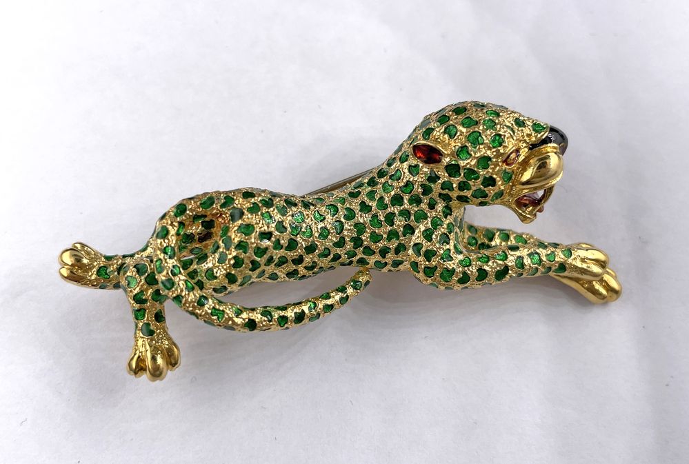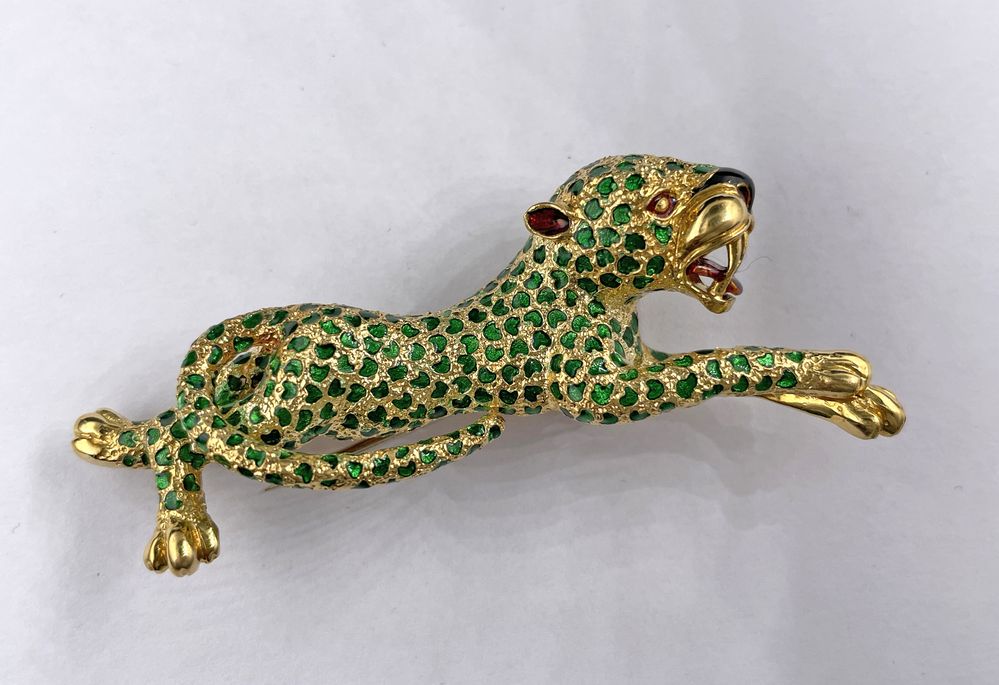 SPILLA IN ORO GIALLO E SMALTI, FRASCAROLO. Realizzata come un giaguaro in oro giallo, dettagli lumeggiati con smalti verdi e rossi, punzoni per Frascarolo. Peso complessivo 30,04 grammi.