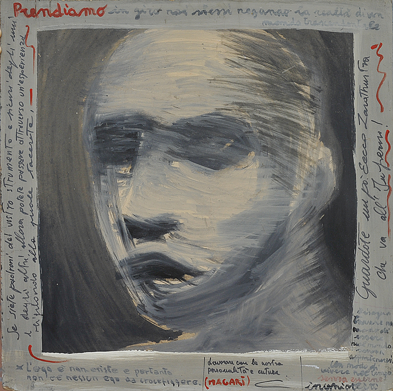 CLAUDIO FACCHI (1955) Zarathustra va all'inferno 5.10.1996 Olio e tempera su tavola 45x46 cm. Variamente iscritto al recto; data firma, dedica ed annotazioni al verso Dono alla rivista Quadri & Sculture, Roma, in occasione della pubblicazione di un articolo