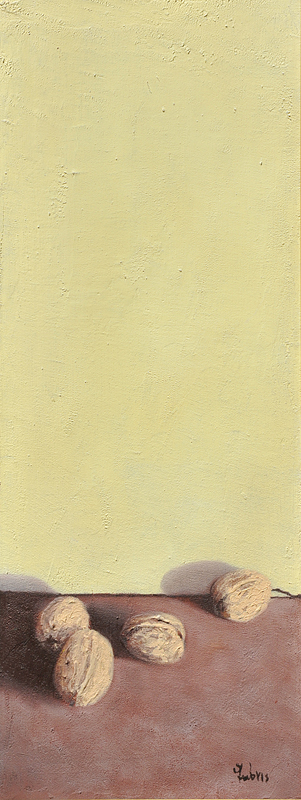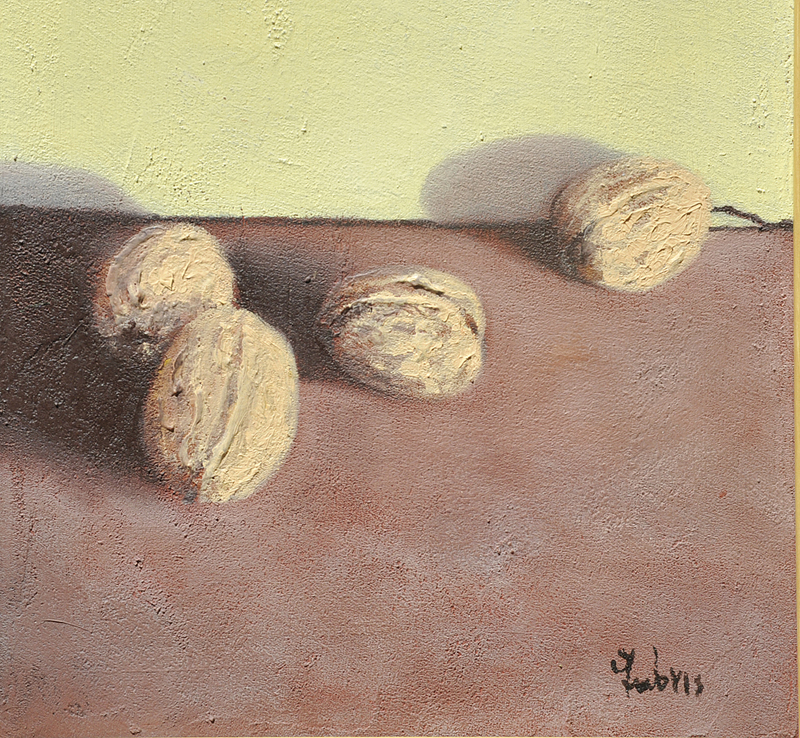 ROBERTO FABRIS (1956) Quattro noci 1998 ca. Acrilico, tempera, olio su tela 20x50 cm. Firma al recto