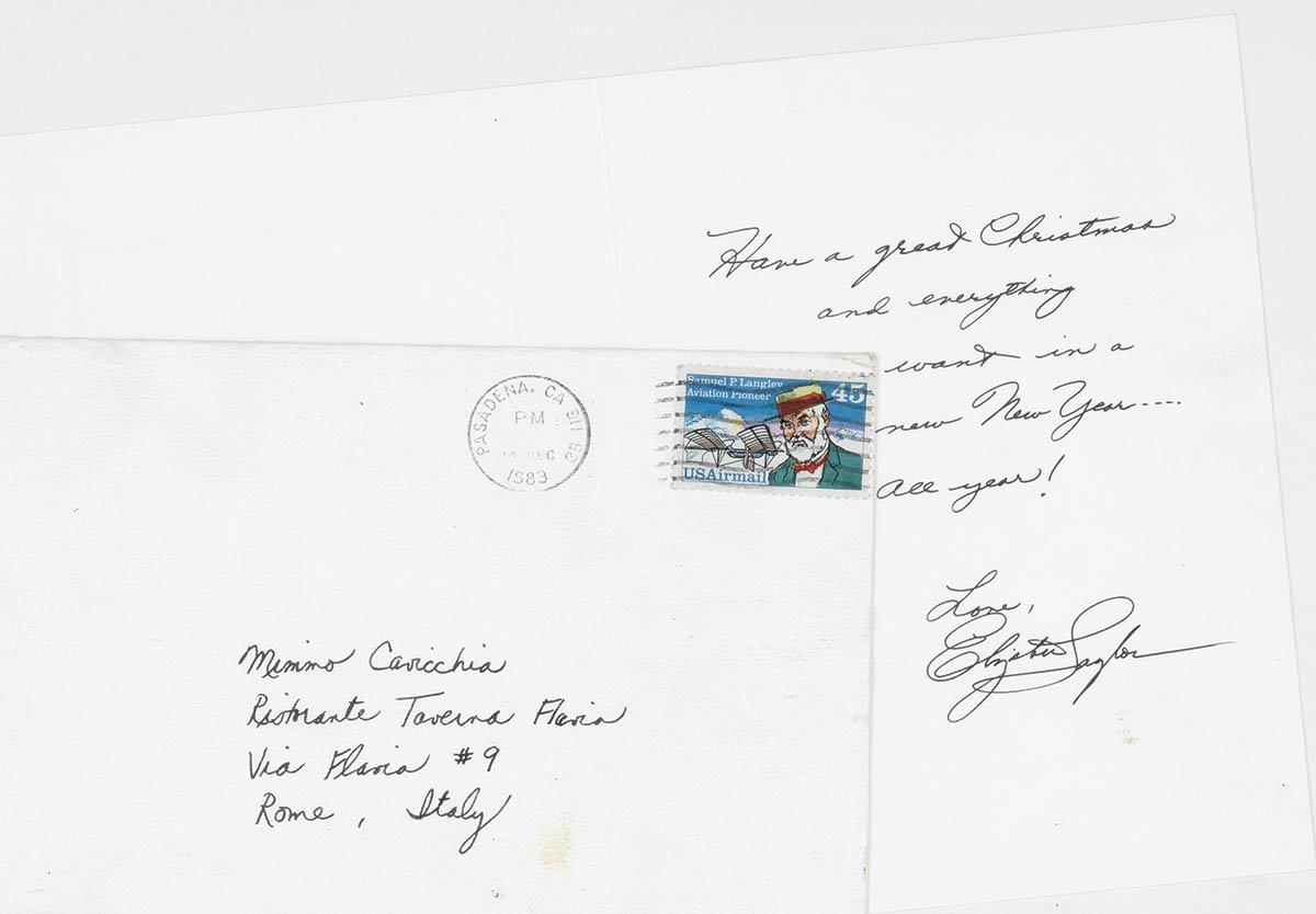 Biglietto autografo con firma indirizzato a Mimmo della Taverna Flavia in occasione del Natale 1983.